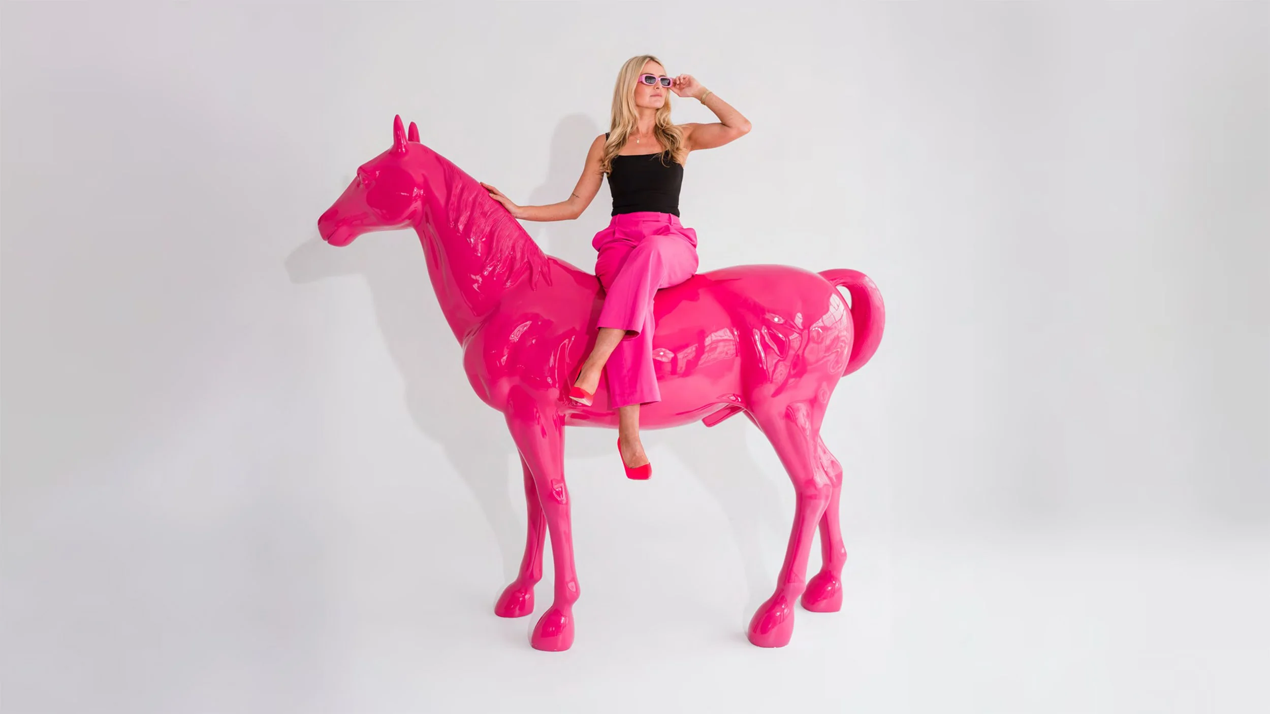 Stop thinking that your brand has to be on paper or on the screen. In 2023 when Kristy opened her physical design studio she had a vision that she wanted a giant pink pony in the office. After relentless searching she found a black horse on Facebook marketplace, had him painted pink and Pedro the Pink Pony was born. Not only has Pedro became a show stopper for people walking past the window, he allowed for the brand to come to life. Pedro is used for photoshoots, the website, stickers and swag and brings a physical asset to the brands identity.